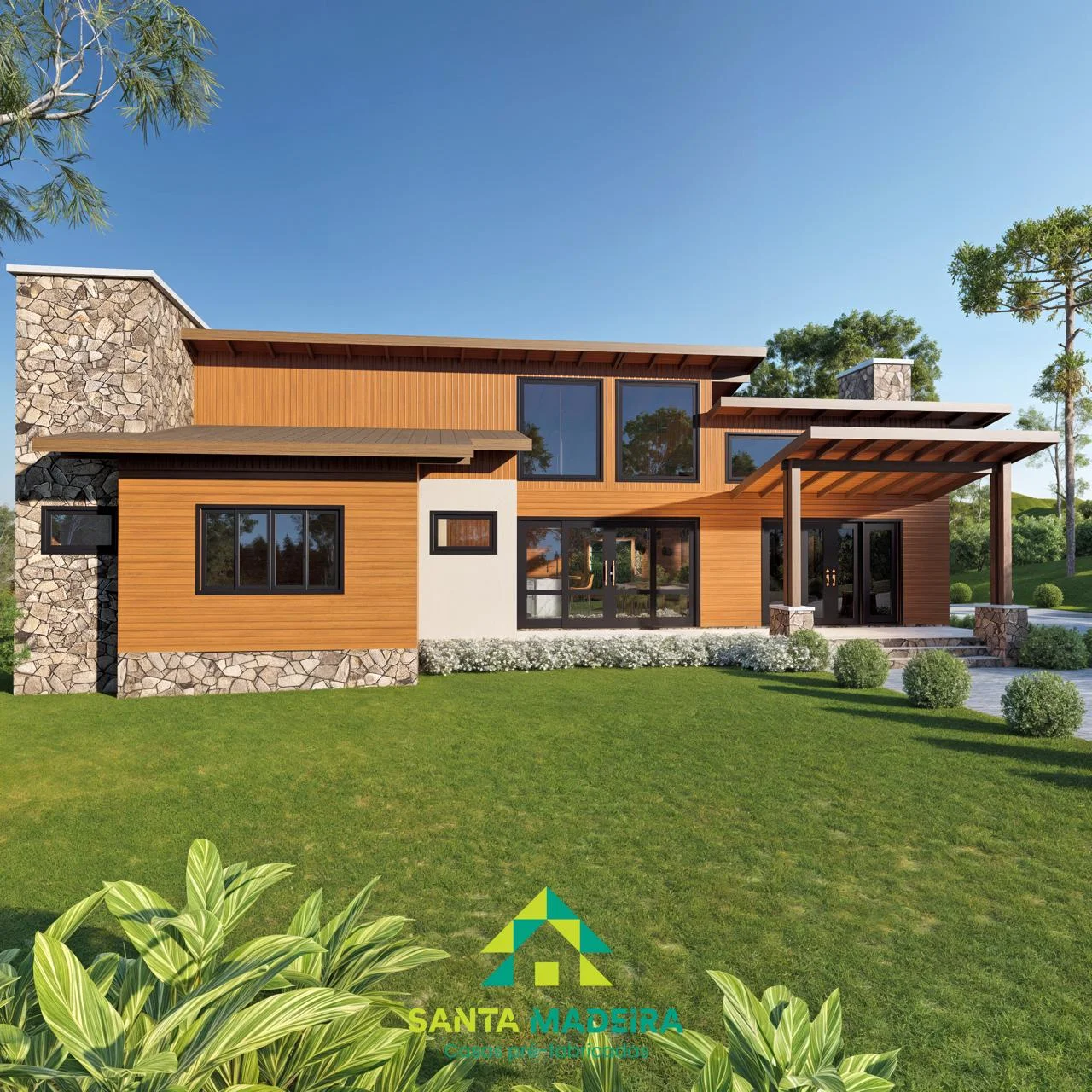 - Área de Lazer e Espaços Adicionais: A casa possui uma varanda coberta e uma lavanderia. A área externa conta com uma garagem coberta por pergolado.